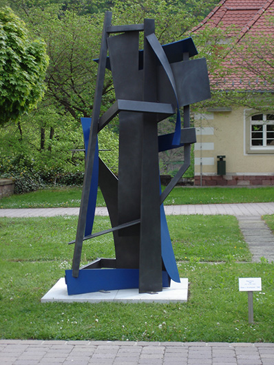 Die Berliner Bildhauerein (geb. 1940) hat bei Phillip King studiert und gehörte der früheren Gruppe "Odious" an, zu der auch die gleichfalls im Skulpturenpark vertretenen Klaus Duschat und Hartmut Stielow gehörten, die Schüler von Bernhard Heiliger waren." Gisela von Bruchhausen thematisiert den Gegensatz von offen und geschlossen, erdenschwarz und himmelblau.